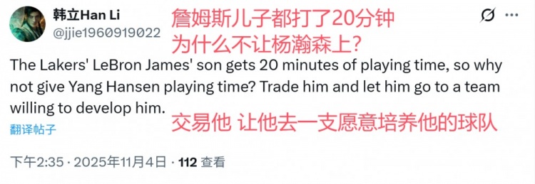 2025-11-04 21:49:40美网友:布朗尼都打20分钟为啥不让杨瀚森上?我们想看中国约基奇