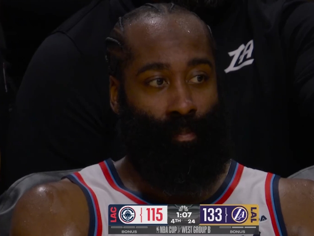 2025-11-26 16:20:23在想什么?比赛已无悬念 哈登眼神黯淡无光 小卡轻抚嘴唇若有所思