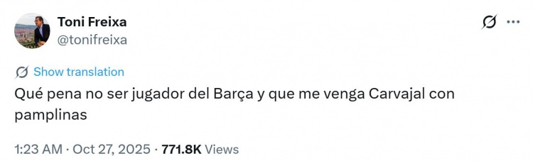 10月27日讯 当地时间10月26日,本赛季西甲第10轮国家德比,巴萨客场1-2负于皇马,前巴萨主席候选人弗雷克萨(Toni Freixa)赛后更新社媒,批评皇马球员卡瓦哈尔缺乏体育精神。