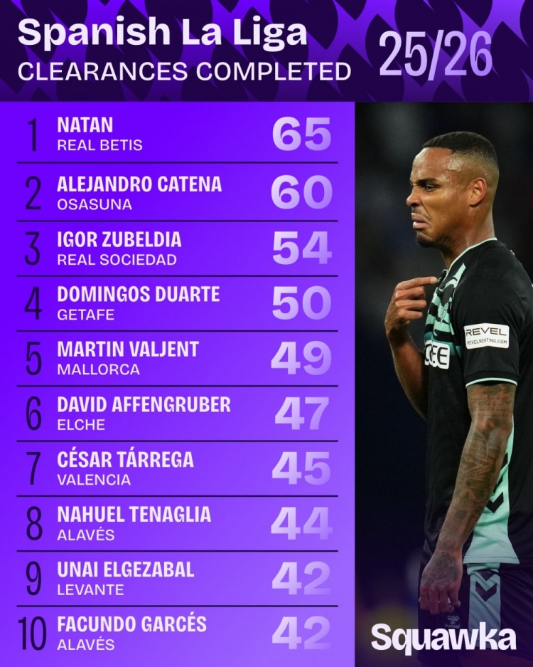 2025-10-08 00:01:52西甲解围次数排行:贝蒂斯后卫纳坦65次居首,祖贝迪亚54次第三