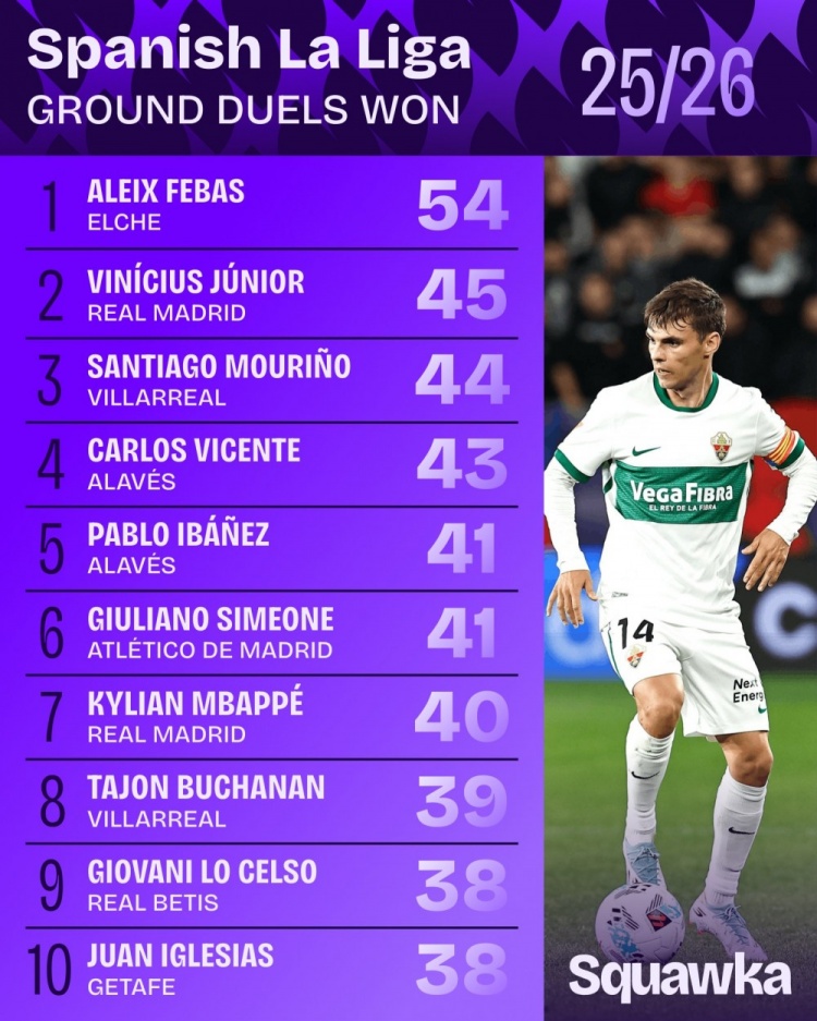 2025-10-08 00:02:52西甲地面拼抢成功次数排行:维尼修斯45次第二 姆巴佩40次第七